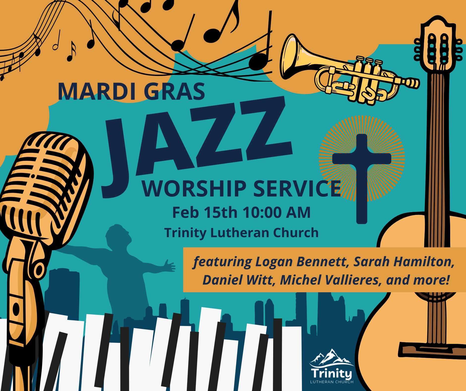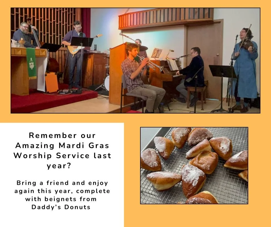Feb 15 Mardi Gras Jazz Worship Service Sunday, February 15, 2026 10:00 a.m. 11:00 a.m. Google Calendar ICS View Event →
